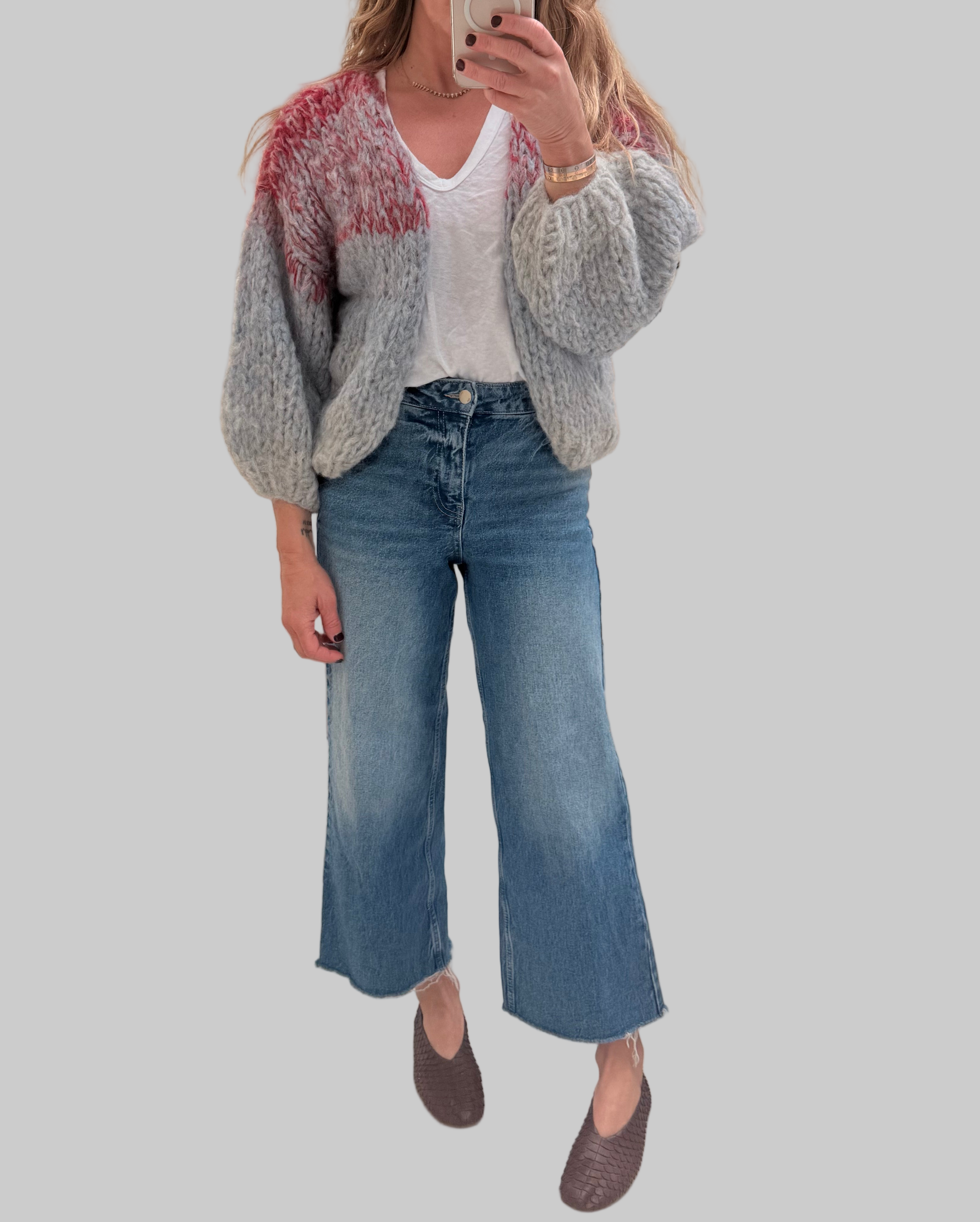 Fleecy Alpaca Ombre Bomber Cardi Red + Grey Gradient